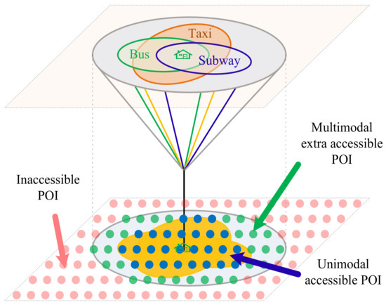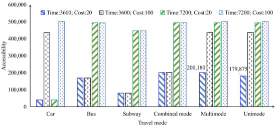 By using multimodal instead of unimodal transportation modes, travelers can access more opportunities, as shown in Figure 7. In order to effectively evaluate the impact of multimodal transportation, the difference value and ratio are used as the evaluation indicator to demonstrate the advantages of multimodal accessibility over unimodal accessibility (1 + 1 ≥ 2), as shown in Equations (29) and (30).