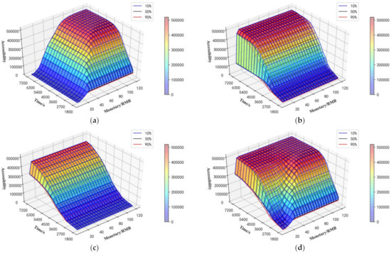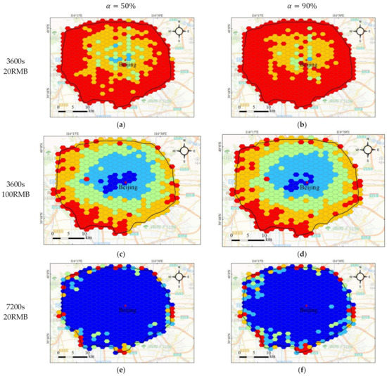 Therefore, as the threshold of travel time increases, the difference in accessibility increases. After that, due to the limitation of the research area, all areas can be reached by travelers, so the impact of reliability on accessibility is ultimately reduced. Comparing the blue, black, and red surfaces of each subgraph in Figure 12, we can see that risk-seeking travelers have the greatest accessibility, indicating that no matter what value takes, the multimodal accessibility will always decrease with the increase in reliability.