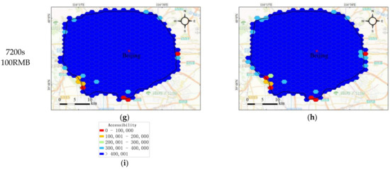 We use the proposed method to evaluate under travel time uncertainty; we set to 50% and 90%, the time to 3600 s and 7200 s, and the monetary cost to RMB 20 and RMB 100. The results are shown in Figure 8, in which Figure 8a–h show the accessibility results of Beijing Fifth Ring Road, and Figure 8i shows the chroma bar. By comparing the accessibility results of different reliability levels under the conditions of the same time and monetary cost, it can be seen that a higher reliability level leads to worse accessibility. By comparing the accessibility results of the same reliability with different levels of time and monetary cost conditions, higher monetary cost constraint leads to better accessibility, as shown in Figure 8a vs. Figure 8c, Figure 8b vs. Figure 8d, Figure 8e vs. Figure 8g, and Figure 8f vs. Figure 8h. Higher time constraint leads to better accessibility, as shown in Figure 8a vs. Figure 8e, Figure 8c vs. Figure 8f, Figure 8b vs. Figure 8f, and Figure 8d vs. Figure 8h. As can be seen, it is necessary to take into account the impact of multiple constraints, such as time and monetary costs, when assessing accessibility under travel time uncertainty. The impedance heterogeneity between different modes is significant, so it is biased to take time as the only impedance. In addition, regional accessibility is high in the central area, gradually decreasing toward the suburbs.