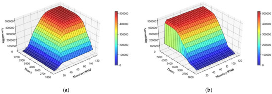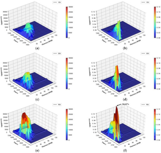 We plot the difference and ratio between unimodal accessibility and multimodal accessibility, as shown in Figure 11. In [2700 s, 5400 s] and [RMB 10, RMB 40], the advantage of multimodal accessibility is more obvious. The advantage reaches the maximum value around 3600 s and RMB 20, showing a central symmetry. As the impedance threshold increases, all POIs in the research area can be reached, so that the level of advantage tends to become zero. In terms of the central research grid, with the increase in , the accessibility of multimode is better than that of unimode. The reason is that a higher allows travelers to reach a smaller travel range. The number of POIs in Beijing decreases from the center to the suburbs. Therefore, the multimode can obtain a relatively larger number of POIs than the unimode, resulting in obvious advantages, i.e., . The advantage of multimodal over unimodal accessibility increases with reliability, and it can be improved up to 14.61% by multimodal transfers (see Figure 11f).