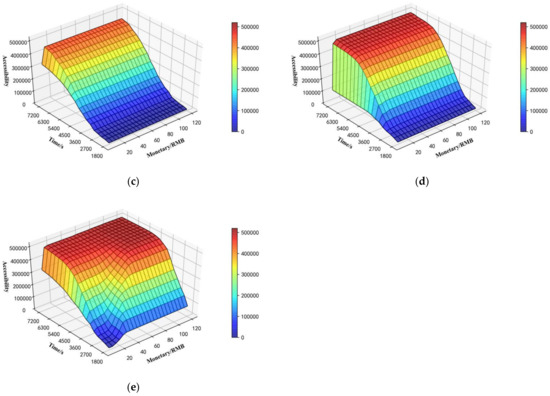 We take the central grid as an example to analyze the advantages of multimodal networks over the unimodal network, where Tiananmen Square is located. We plot the accessibility of each mode under the condition of different times and monetary costs, as shown in Figure 9. According to Figure 9a, the accessibility of the taxi mode is mainly limited by travel monetary cost constraints. For the mode of bus or subway, however, according to Figure 9b,c, the accessibility of the bus or subway mode is mainly limited by travel time constraints. Figure 9d shows that the accessibility trend of combined transportation is the same as that of the public transportation subway, which is mainly restricted by travel time constraints. This is because the network division method proposed in this paper was used to obtain the combined transportation networks, with bus or subway as the main transportation mode. Comparing Figure 9d,e, the accessibility of the combined mode is worse than that of the unimode under certain budgets. Compared with Figure 9a–d, Figure 9e indicates that multimodal can effectively improve the accessibility of the area. Due to the limitation of the research area, when accessibility grows to a certain level, it no longer grows.
