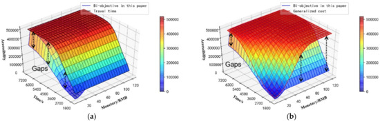 In order to verify the superiority of the accessibility model and algorithm, we set to 90% and VOT (value of time) to RMB 52.7, according to the average salary in Beijing, and use three different types of methods to calculate accessibility, as shown in Figure 13. Compared with the travel time method [19], our bi-objective accessibility method can effectively reflect accessibility with low-cost budgets and eliminate the gaps caused by ignoring cost budgets (see Figure 13a). Compared with the generalized cost method [23,25], our proposed method can effectively reflect accessibility with low-cost and high-time budgets or low-time and high-cost budgets, and eliminate the gaps caused by converting time to generalized cost budgets (see Figure 13b). Thus, the superiority of the two-stage bi-objective opportunity model is validated.