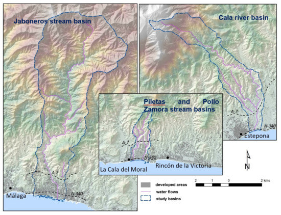 Four study areas have been selected (Figure 1 and Figure 2) in order to collect the characteristics and diversity of the basins located in peri-urban areas of the Spanish Mediterranean coast. Thus, it is intended to represent the main urban and territorial models of this region of risk. The analyses have been performed at a basin scale, in order to evaluate the physical processes that take place in them. The selected basins are the Cala River basin (Estepona), the Jaboneros stream basin (Málaga), the Piletas stream basin, and the Pollo Zamora stream basin (Rincón de la Victoria). All of them are located in the province of Málaga in southern Spain (Figure 1).