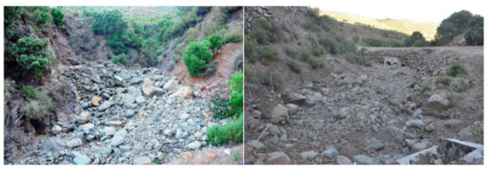 Regarding the geomorphological pattern, all the basins have a rugged topography with enclosed channels and gullying slopes caused by rhexistasy due to intense deforestation for hundreds of years. Another important topographic characteristic is the proximity of the mountainous to the sea, so the basin is very close to the coast, the slopes are steep, and the littoral plain is narrow. These are rapid drainage routes, as indicated not only by the geomorphology of the channels but also by the presence of sediments, sometimes deposited as alluvial fans. The morphology and hydraulic functioning of the channels depend on conditioning factors, but the patterns vary according to the section of the basin. The study area includes ephemeral rivers, streams located in enclosed rocky substrates (canyons), streams located in open rocky substrates, and streams located in alluvial fans. Generally, once flows are activated by a storm, streams can become braided rivers. When water levels are low or moderate, rivers form meanders, but with rising levels, rivers can become straight and braided, until the braids coalesce. Hazard levels increase, as energy cannot be easily dissipated. Another characteristic of the study areas is the presence of fans, which appear between the canyons at the upper and middle sections and the flood plains, where the channel is no longer enclosed. They usually indicate areas of greater hazard, where sudden changes in the hydraulic behavior of the river will foreseeably occur.