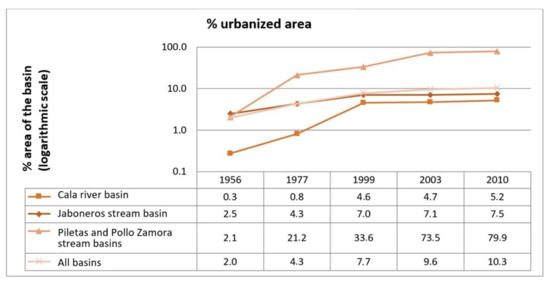 Between 1956 and 2010, the total flooded area increased by 17% at the Cala River basin, and it doubled at the Piletas and Pollo Zamora basins. On the other hand, in the Jaboneros stream, it decreased by 13%, which shows the impact that changes in land use have had on the hazard of flood.