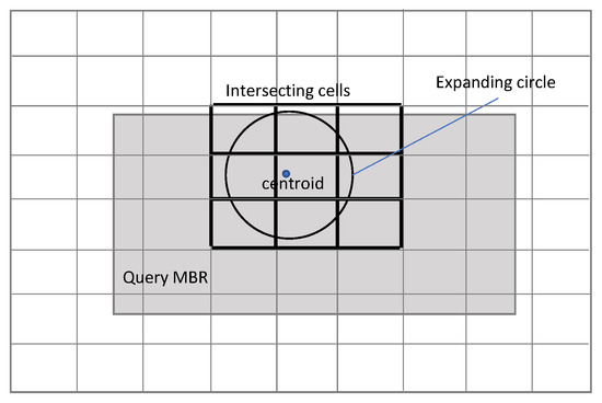 In the MBR selection method, all cells that intersect with the query MBR are eligible for searching for candidate neighbors. The problem is that there are too many points to examine, and Phase 2 has an excessive amount of work to do. In the centroid circle method, the eligible cells are significantly reduced so that only those who intersect with a generally small circle around the centroid (expanded if necessary to include at least K training points) are checked for neighbors. Both methods are shown in Figure 2 and Figure 3. See [14] for the pseudo-codes.