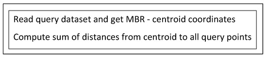 - Preliminary step. Local calculation of a sample-based quadtree, the sorted list of query points, query MBR and centroid coordinates, the sum of distances from centroid to Q. These are needed by most of the pruning heuristics.
