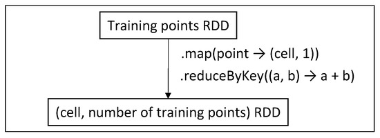 Spark’s web UI shows that once persisted, the training points RDD resides in RAM until the end. Phase 1 includes a wide transformation (), but is still more economical than Hadoop’s shuffling. Phase 2 reads the persisted training points RDD from RAM and includes one wide transformation () applied on very few cells and points. Finally, Phase 3 reads two persisted RDDs, training points and the Phase 1 output, and also includes one wide transformation (). All the other transformations are narrow, meaning that data are processed locally and in-memory, which explains the performance differences.