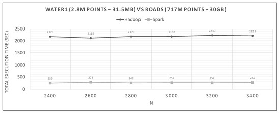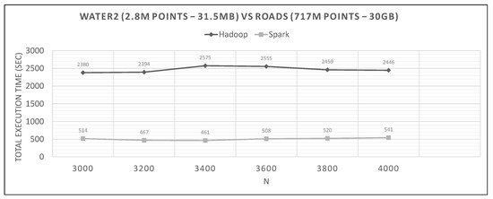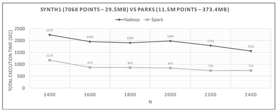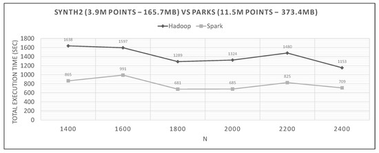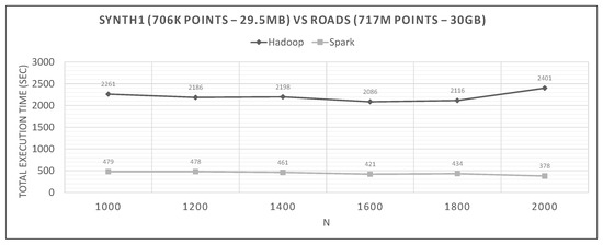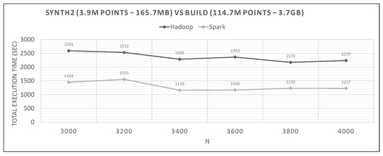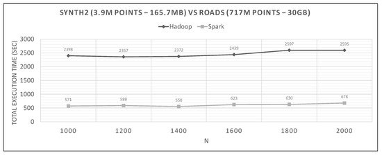 - Spark’s performance remains mostly unchanged for a wide variation of N; it is an almost flat line in many graphs. However, the best performing Ns are the larger ones, as can also be observed for Hadoop in these experiments and in the literature (Section 2.2). More cells mean fewer points inside each and, therefore, fewer calculations per cell.