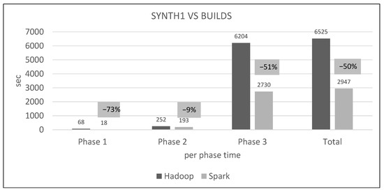 Having presented all the graphs from the experiments, we can now discuss and interpret them. First of all, it must be noted that space partitioning is exactly the same for both systems; utility classes and functions are mostly unchanged; pruning heuristics and fast sums technique are applied similarly; and each phase processes the same points for each dataset couple and N. Consequently, Spark’s superior performance derives primarily from its in-memory handling of data and the algorithmic and coding adaptations performed toward that direction, instead of Hadoop’s constant read/write to disk.