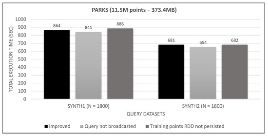 Firstly, we deactivate the broadcasting of the query dataset (Figure 12) so that every time it is needed, it is transmitted to all workers. This will happen for every cell examined by Phases 2 and 3. Secondly, we try not persisting the training points RDD (Figure 13) to see if its re-computation will gain an advantage over the cached one’s serialization/de-serialization CPU overhead. The results are depicted in Figure 31, Figure 32 and Figure 33.