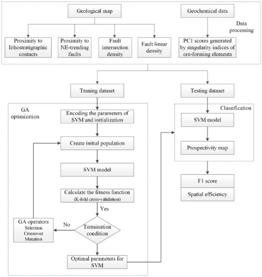 - Classification. An SVM model was trained with the optimal parameters, and a prospectivity map was produced. Ultimately, the F1 score and spatial efficiency were combined to evaluate the classification ability of the GA–SVM model.