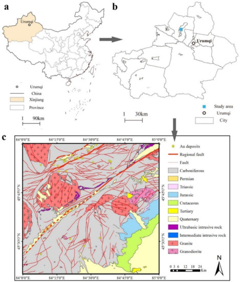 In this study, a spatial dataset was derived from established multi-source geological spatial databases containing geological and geochemical data. Geological maps at a scale of 1:200,000 were collected from the Bureau of Geology and Mineral Resources of Xinjiang. Stream sediment geochemical data at a scale of 1:200,000 were obtained from the National Geochemical Mapping Project of China, with a sampling density of 1 per 4 km2 [52].