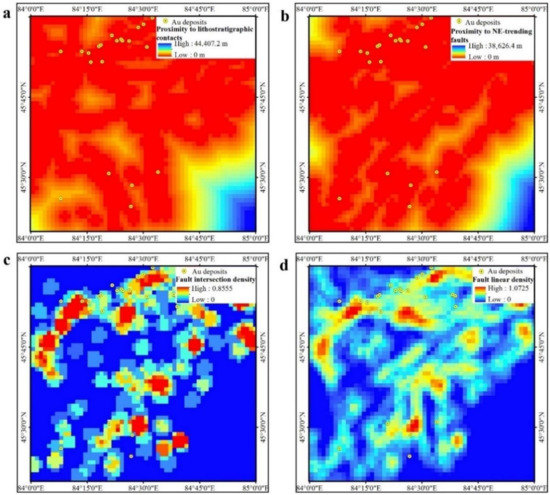 In this area, Au deposits are mainly hosted in Carboniferous formations or in contact with granitoid intrusions. The contacts of the granitoid intrusions and the stratigraphic units between the Tailegula, Xibeikulasi, and Baogutu Formations were extracted from a 1:200,000 geological map of the study area, and a map of proximity to lithostratigraphic contacts was produced using Euclidean distance in the ArcGIS environment (Figure 3a). Similarly, a map of proximity to NE-trending faults was generated (Figure 3b), because NE-trending faults play a dominant ore-controlling role during Au mineralization. Fault density, consisting of fault intersection density and fault linear density, reveals the spatial relationship between the development and accumulation levels of faults and Au deposits. Here, the fault intersection density and fault linear density were analyzed, and the corresponding maps were generated using point density and line density in the ArcGIS environment, respectively (Figure 3c,d).