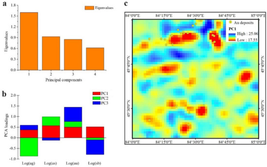 PCA results for the geochemical dataset: (a) Scree plot of the principal component (PC1–PC4) eigenvalues for singularity indices of ore-forming elements; (b) loadings on principal components (PC1–PC3); (c) PC1 scores generated by singularity indices of ore-forming elements.
