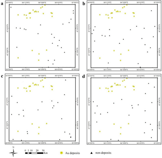 The application of the GA–SVM model for MPM requires a training dataset with geological feature vectors of five evidence layers and a target variable to represent mineral prospectivity. The target variable expresses mineralized locations or non-mineralized locations with scores of 1 and 0, respectively. For mineralized locations, we used 24 known Au deposits to ensure classification accuracy. For non-mineralized locations, we used point pattern analysis [57,58] to analyze the nearest-neighbor distances between every pair of deposits within the study area to determine the optimal distance from known deposits at which the probability of finding a deposit decreased. In this study, most of the nearest-neighbor distances were less than 14.5 km, and there was only one outlier. Thus, 14.5 km is regarded as the optimal distance for the selection of non-mineralized samples. In addition, to obtain a balanced dataset, the number of non-mineralized samples should be the same as the number of known Au deposits. To this end, we created four training datasets, each consisting of 24 randomly selected non-mineralized samples, according to the selection criteria used by Carranza et al. [30]. Figure 5 shows the spatial distribution of the four training datasets.