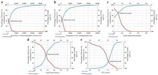 Prediction-area (P-A) plots for evidence layers: (a) proximity to lithostratigraphic contacts; (b) proximity to NE-trending faults; (c) fault intersection density; (d) fault linear density; (e) PC1 scores generated by Ag, As, Au, and Sb.
