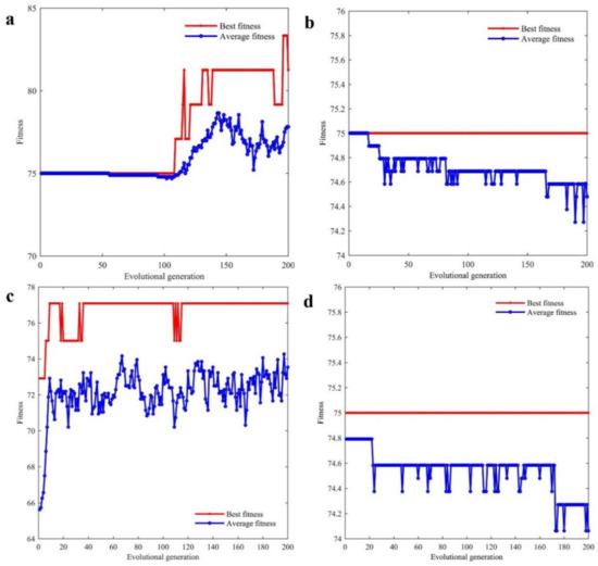 The parameters searching process of GA: (a) training dataset 1; (b) training dataset 2; (c) training dataset 3; (d) training dataset 4.