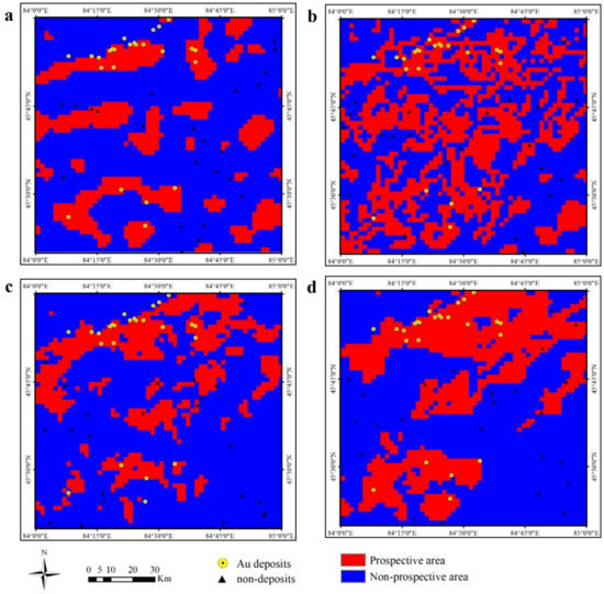 Prospectivity maps generated using GA–SVM model: (a) training dataset 1; (b) training dataset 2; (c) training dataset 3; (d) training dataset 4.