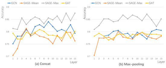 Comparison of the JK-Net architecture of (a) Concat and (b) Max-pooling, representing the accuracy of different layers.