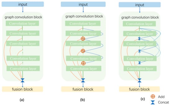 Three different deep architectures, JK-Nets, ResNet, and DenseNet, were designed for the graph-convolution block, as shown in Figure 2. These architectures aggregated all the outputs of the graph-convolution layer and served as inputs to the next layer. Notably, the graph-convolution layer extracted the features of the local information, and the deeper the graph-convolution layer, the wider the range that was utilized. Therefore, the outputs of the different graph-convolution layers represented the features of different ranges.