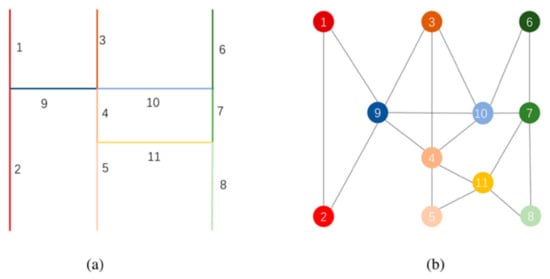 In graph theory, nodes are often used to represent target objects, and edges represent the relationships between the objects. The target object of road network selection is a road; therefore, a dual representation that regards roads as nodes may be expected to perform better. In addition, GCNs tend to aggregate the characteristics of nodes rather than edges. In summary, in this study, the road network was abstracted as an undirected unweighted dual graph, as shown in Figure 3, and the problem of road network selection was transformed into a problem of node classification in the GCNs.