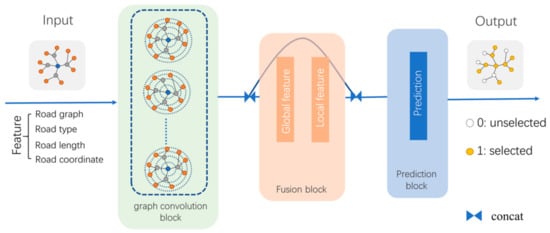 The model was divided into three parts: a graph-convolution block, a fusion block, and a prediction block, as shown in Figure 4. The graph-convolution block was used to extract the local spatial features of the road network, the fusion block was used to fuse global features and different local features, and the prediction block was used to predict the selected results.