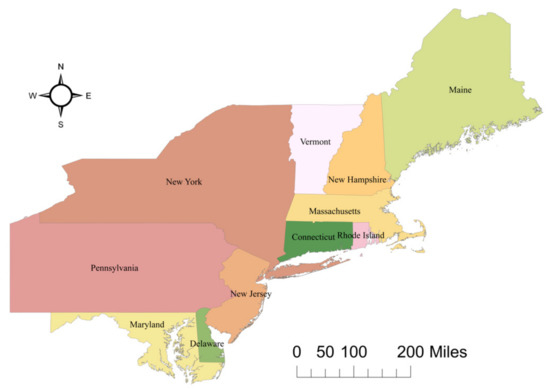 We selected the northeastern region of the United States of America as our study area because the distribution of the road network is comparatively more complex, with different densities and various road structures, while road networks in other regions are too dense and mostly grid structure. Therefore, the road network in the Northeast is more representative, which can show the compatibility of our model. Notably, in this study, we adopted a small-scale road network with less semantic information and more spatial information because our main research purpose was to explore the ability of GCNs to learn the spatial characteristics of road networks. In summary, we downloaded small-scale maps (1:1,000,000 and 1:2,000,000) of a road network in the northeast of the USA, with a total of 5172 roads, including 11 states. The 11 states were (from north to south) Maine, New Hampshire, Vermont, New York, Massachusetts, Rhode Island, Connecticut, Pennsylvania, New Jersey, Delaware, and Maryland (Figure 5).