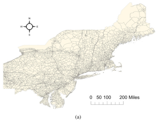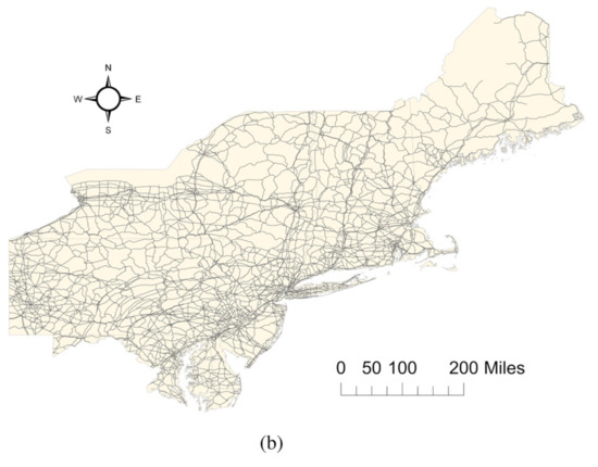 Small-scale map for northeastern United States of America road network: (a) 1:1,000,000 and (b) 1:2,000,000.