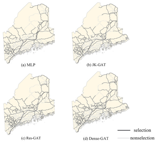 The findings of the above analysis revealed that the GAT model has the best performance; therefore, we used the trained GAT model to predict road network selection in Maine. We also used MLP and compared its selection effects with four other types of GCN models to prove the effectiveness of deepening GCNs; the results are shown in Figure 7.