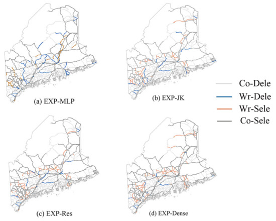 Combinations of the road network obtained using different models and the road network selected by experts: (a) expert and multilayer perceptron (EXP-MLP); (b) expert and JK-GAT (EXP-JK); (c) expert and Res-GAT (EXP-Res); and (d) expert and Dense-GAT (EXP-Dense). Co-Dele represents correctly deleted roads, Wr-Dele represents incorrectly deleted roads, Wr-Sele represents incorrectly selected roads, and Co-Sele represents correctly selected roads.