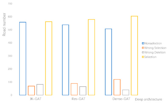 Among three types of GCN models, it may be observed that the road connectivity of JK-GAT (the combination of JK-Nets and GAT) and Res-GAT (the combination of ResNet and GAT) indicated good results, with relatively balanced rates of selection and deletion. Figure 10 shows a distribution histogram of the predicted results of the GCN models. The predicted results of the first two models were roughly the same, and the distributions of correct selections and wrong selections were relatively uniform, which can maintain the distribution and density of the road network. However, there was a large difference between the numbers of incorrectly selected and deleted roads in Dense-GAT, which may destroy the distribution characteristics of the road network and greatly reduce the selection performance.