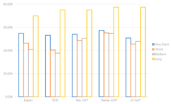 Notably, JK-GAT obtained the best performance in terms of accuracy rate (with a rate of 88.12%), whose line density was closest to the results selected by the experts. Moreover, as for the prediction time, Res-GAT obtained the lowest time (2.7 s), while the prediction time of Dense-GAT was as high as 5.84 s because of the complexity of its structure. As mentioned above, every hidden layer is linked to the others in the DenseNet architecture (as shown in Figure 2), while JK-Nets only connects them to the last layer and ResNet simply adds them without Concat, so DenseNet took the longest time.