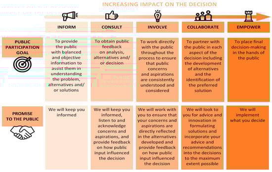 - International Association of Public Participation IAP2 Spectrum of Public Participation. Available online: https://cdn.ymaws.com/www.iap2.org/resource/resmgr/pillars/Spectrum_8.5x11_Print.pdf (accessed on 11 March 2019).