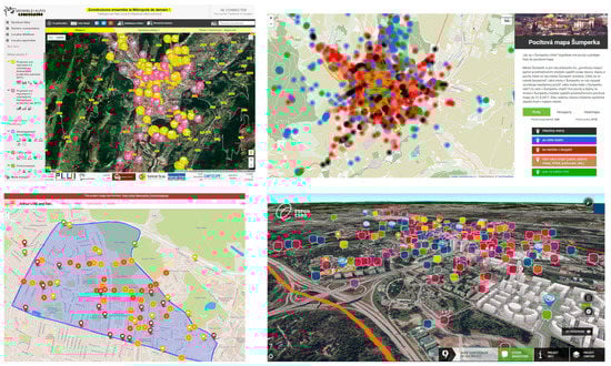 The initial sample used in our research consisted of 150 web-based geoparticipation projects. The sample concerns all the platforms listed in Supplementary S1 (some examples are: Bästa Platsen, Carticipe-Debatomap, CityPlanner, Commonplace, coUrbanize, Emotional Maps, Maptionnaire). The initial sample of 150 projects reflects the number of projects the authors identified that matched the criteria listed below. We adopted a two-tiered purposive sampling strategy. First, we selected relevant web-based geoparticipation platforms (Figure 2) shows four examples based on the following criteria: (i) their use in formal urban planning, typically initiated by local councils/municipalities; (ii) the range of participatory mapping functionalities for citizen participation (e.g., 3D visualization, geoparticipation, ideation, voting, ranking).