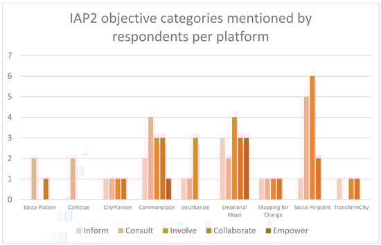 Involvement, consultation and collaboration were the most mentioned public participation objectives, respectively. Half of the respondents (15/28) selected more than one objective for public participation. This indicates that web-based geoparticipation platforms can facilitate several objectives simultaneously as well as single objectives. Across all projects, web-based geoparticipation was also carried out alongside in-person engagement methods. Our analysis of the responses did not reveal any conclusive trends across different types of urban planning projects. We thus structured our findings based on each objective for public participation, instead of per type of urban planning project or project location. For simplicity of presentation, the findings concerning the objectives for web-based geoparticipation are structured as they appear on the SPP (i.e., starting with “Inform” and ending with “Empower”). The findings presented are based on the SPP categories which the respondents selected, rather than on any re-interpretation by the authors. The pragmatic and theoretical implications of the findings are discussed in a separate section after the findings. Figure 3 shows the SPP categories in relation to the web-based participatory mapping platforms used by the planners.