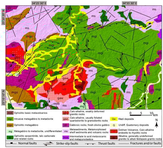 The Abu-Dabbab area is bounded by longitudes 34.35° to 34.65° E and latitudes 25.15° to 25.35° N (Figure 1). It occupies a region of about 640 km2 at the south-eastern part of the Egyptian Eastern Desert. The Abu-Dabbab area is located far north of Marsa Alam city and west of the Red Sea coast by 30 and 29 km, respectively (Figure 1). The Abu-Dabbab area represents a part of the central Eastern Desert that mostly consists of low-grade volcano-sedimentary rocks with large gabbroic and granitic intrusion [41] (Figure 2). The oldest units in the region are metasediments that are composed of alternating beds of metasandstone, meta-greywackes, and quartize-feldspar paraschist [26,41]. The study area comprises a small intrusion of talk-carbonate serpentines and gabbro rock units. The intruded bodies are mostly dissected by strike-slip and normal faults. The granitic rocks of the Abu-Dabbab area were divided into two major rock types—older and younger granites [41,42]. Tectonically, two sides of the Red Sea are affected by a major NW–SE tectonic trend in addition to the sinistral Najd Fault Shear Zone (NFSZ), which crosses both the Red Sea and the Arabian–Nubian Shield for about 1000 km [43]. The author in Ref. [44] classified the main tectonic elements in the Eastern Desert into three categories—(i) E–W trending fault systems, (ii) the Gulf of Suez trending fault systems, and (iii) the Gulf of Aqaba trending fault systems. Some researchers consider the Abu-Dabbab area a big, dome-like structure [27]. The study area is characterized by several elongated rock units, such as ophiolitic metagabbro and intrusive metagabbro to metadiorite, that are dissected by various fractures (Figure 2). Three different structural lineaments are distributed over the whole area in different directions. In the study area, the strike-slip faults are NNW–SSE trending, whereas normal faults are N–S trending (Figure 2).