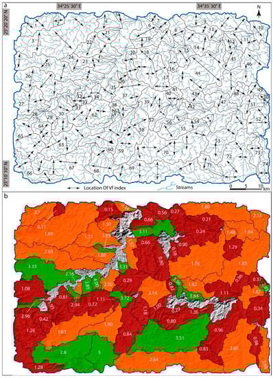 The Vf values were calculated for 74 sub-catchments in the study area. The calculated data were extracted across the mainstream for every sub-catchment. The Vf values were grouped into high, medium, and low tectonic activity classes (Figure 5a,b). The locations of the calculated Vf index are shown in Figure 5a, and the Vf values of the Abu-Dabbab area are shown in Figure 5b. The values of this index are range from 0.11 to 0.15 for Sub-catchments 2 and 4, respectively, and the highest value Vf = 5 was computed for Sub-catchment 68. Generally, most of the sub-catchments had low Vf values, while the highest values covered a large area in the south part of the study area (Figure 5b). Accordingly, tectonic classes of the Sub-catchments 37 and 22, as inferred from the Vf values, were Class 1 and Class 2, respectively. The low tectonic Vf class was recorded for the remaining 15 sub-catchments.