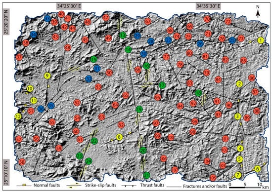 Advanced Spaceborne Thermal Emission and Reflection Radiometer (ASTER) and Landsat-8 (OLI) imagery were used to produce greyscale base images utilizing ENVI 5.0 software. Image processing, such as contrast stretching and edge detection, was applied to enhance the greyscale image quality. PCI Geomatica software was utilized to process the greyscale images to extract different lineaments. The produced lineaments were compared with previous studies [43,44] that have reported on the geological features to identify the coinciding tectonic elements. Some linear structures, such as railroads and rivers, were carefully removed from our dataset. The Abu-Dabbab area lacks studies that focus on its tectonic framework. Therefore, it has required extensive fieldwork to map the various unknown tectonic elements. Based on the previously reported data [26,41,45], lineaments were categorized into normal faults, strike-slip faults, thrust faults, and fractures and/or faults.