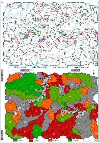 The Af index values show various basin asymmetry with block tilts. The values indicate that the symmetrical sub-catchments (Class 0) represent 24% of the total catchments of the studied sub-catchments (Figure 7). Class 1 sub-catchments are mostly located in the southern part of the study area and are represented by Sub-catchments 57, 60, 67, 69, and 70, while most of the north-western part of the study area is covered by Class 3 sub-catchments (Figure 7).