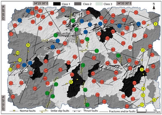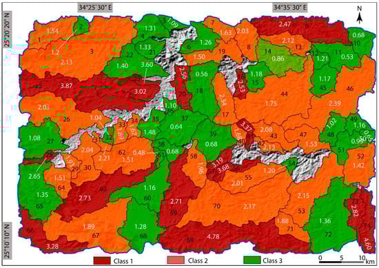 In this study, the relative tectonic activity index (RTAI) method was applied separately along the 74 sub-catchments. The average values of five computed indexes were estimated to yield the RTAI and to help illustrate the distribution of the relative active tectonics of the study area [55]. For the RTAI evaluation, we divided the morphological indexes into tectonic activity classes, as high (Class 1), moderate (Class 2), and low (Class 3) tectonic activity.