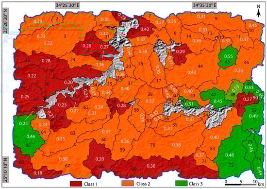 The Hi index values range from 0.20 (Sub-catchment 32) to 0.55 (Sub-catchment 45). In analyzing the Hi index map, one can infer that the majority of the study area is covered by Hi Class 2 (Figure 8). Class 1 sub-catchments are mostly located in the southern and western parts of the study area, while Class 2 is represented by the smallest area in the south-eastern part of the region (Figure 9).
