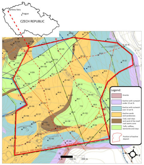 Research of critical and strategic minerals plays a crucial role in strategic planning on how to deal with these minerals in all countries, including the Czech Republic [1]. In the Czech Republic, kaolin, which is a key raw material for various industrial applications, was also included among the national critical raw materials [1]. For instance, it is used in the production of porcelain, washed kaolin, as a filler in the production of paper, and as an additive to paints and in refractory materials. It is also used in the cosmetics, pharmaceutical and food industries. The Czech Republic belongs to the leading states in Europe and the world, both in the mining of raw kaolin and in the production of washed kaolin. Other world’s major sites with the occurrence of kaolin include USA, UK, Brazil, China, and Germany [2].