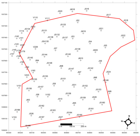 - Verification and correction of input data. Verification and correction of the input data are performed by the comparison of the data with information from archive reports using the visualization (in 2D and 3D), and the comparison with the corresponding archive horizontal and vertical sections (see Step 1). In the case of our example of the kaolin deposit Jimlíkov–East, many errors in the data were found. The sources of these errors are various. However, most of them were caused by typographical mistakes during the digitalization process. The calculation includes corrected data from 85 exploration drill holes (Figure 2) and 1098 analyzed samples, for which the categories (classes) of the reserves according to Table 1 were calculated with respect to the content of kaolin outwash, Al2O3, Fe2O3, and TiO2.