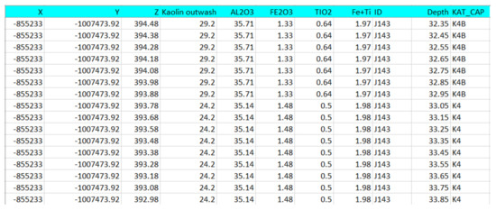 - Detailed and precise spatial definition of categories of reserves (see Table 1), based on precisely determined spatial distribution of kaolin outwash content, Al2O3 content, Fe2O3 content and TiO2 content—implementation by the Kaolin_A program;
