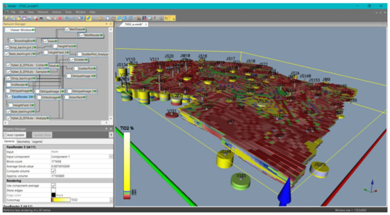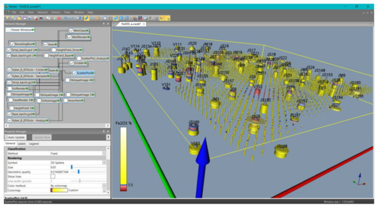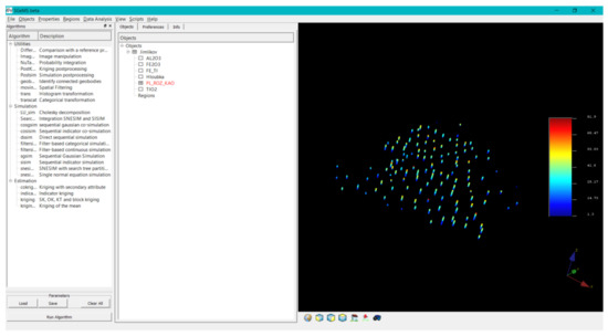 Figure 4. Example of visualization of data transferred to the SGeMS environment—the example presented depicts the visualization of kaolin outwash. - Statistical processing of the technological parameters. Basic statistical processing of the technological parameters is performed in the SGeMS environment [22]. An example of the output is given in Figure 5—histograms of the frequencies of individual technological parameters and their basic statistical characteristics.