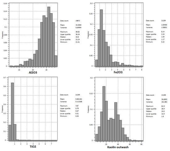 Figure 5. Histogram of frequencies of parameters Al2O3, Fe2O3, TiO2 and kaolin outwash (wt %), and their basic statistical characteristics. - Modelling of the bottom and the top of the kaolin deposit and overall lithology. To spatially limit the occurrence of kaolin in the model, it is necessary to model the rock interface of the deposit. Gradually, 2D grids of eight geological layers were created from the crystalline basement to the surface. Based on these 2D grids, the grids of both the bottom and top of the kaolin occurrence were created. These two grids bound the 3D model of the deposit. During mining, it will be necessary to regularly update the grid of the top of the kaolin occurrence.