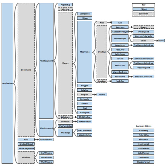 Surfer automation object model [19], including collection objects (gray boxes) and objects (blue boxes).