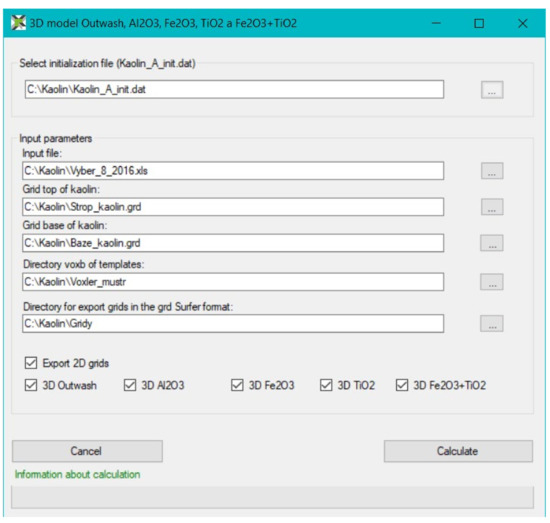 The updated input data (see Section 2, Steps 2–5) is further processed by the program Kaolin_A. Figure 8 shows the application window for entering input parameters. It is necessary to check the input parameters of the directories and files specified in the initialization file. It is also important to check the input parameters for 3D interpolation—anisotropy, grid geometry and selection of samples specified in the initialization file.
