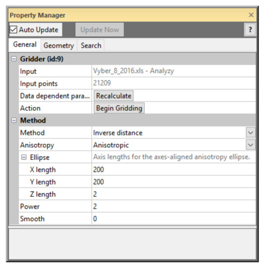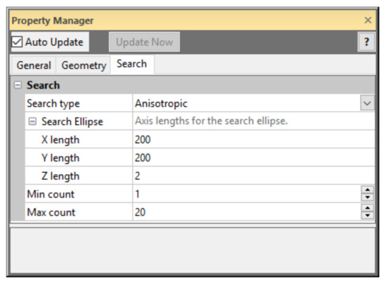 We chose the interpolation method of inverse distances with a significant length of the X- and Y-axes (in this example it is 200 m) and minimal length of the Z-axis (in this example it is 2 m) of a spatial ellipse of anisotropy (Figure 9) and sampling (Figure 10). This is because we could not find generic laws of spatial distribution in the monitored technological parameters, due to the origins of the raw material. The specified geometry parameters for the 3D gridding are presented in Figure 11.